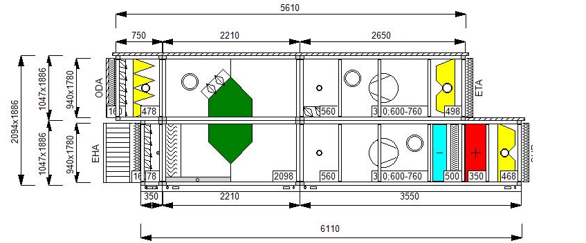 Matę wibroizolacyjną dobiera się analizując powierzchnię styku ramy centrali wentylacyjnej z podłożem oraz masę urządzenia. Dla parametrów ramy jak na powyższym rysunku mata antywibracyjna powinna być podłożona pod całą powierzchnię kształowników stanowiących ramę z uwzględnieniem kilkunastu millimetrów dodatkowego marginesu z każdej strony.